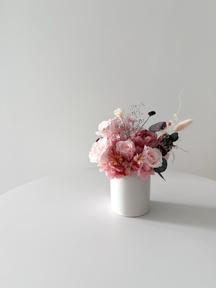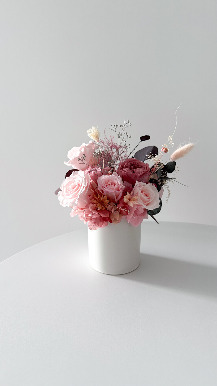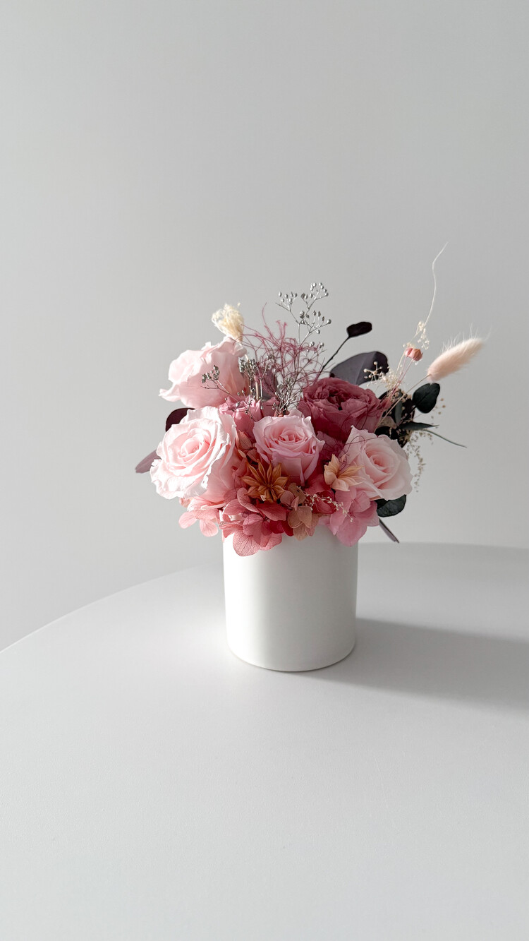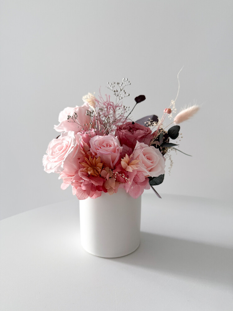 카시스 핑크 프리저브드 수국과 연핑크톤 플라워들이 어우러져 사랑스럽고 우아한 분위기를 연출하는 프리저브드 플라워 센터피스입니다.