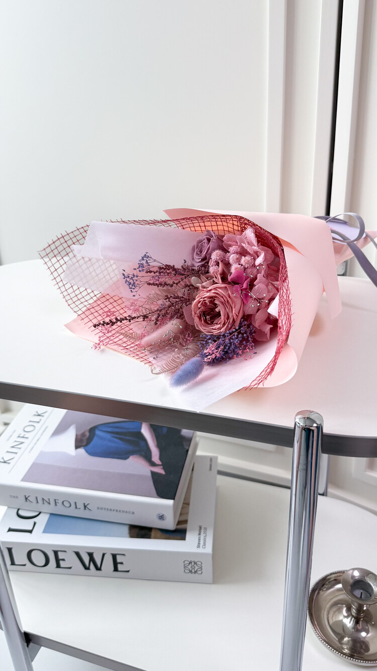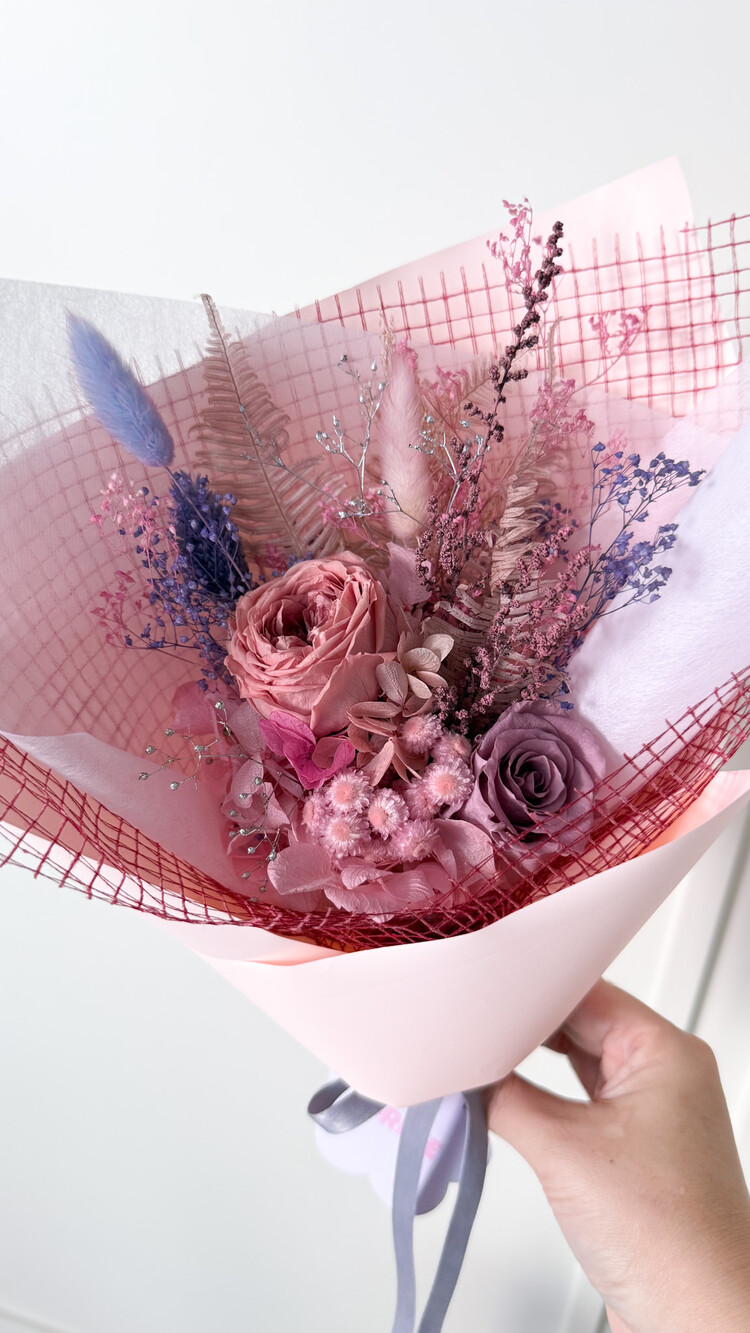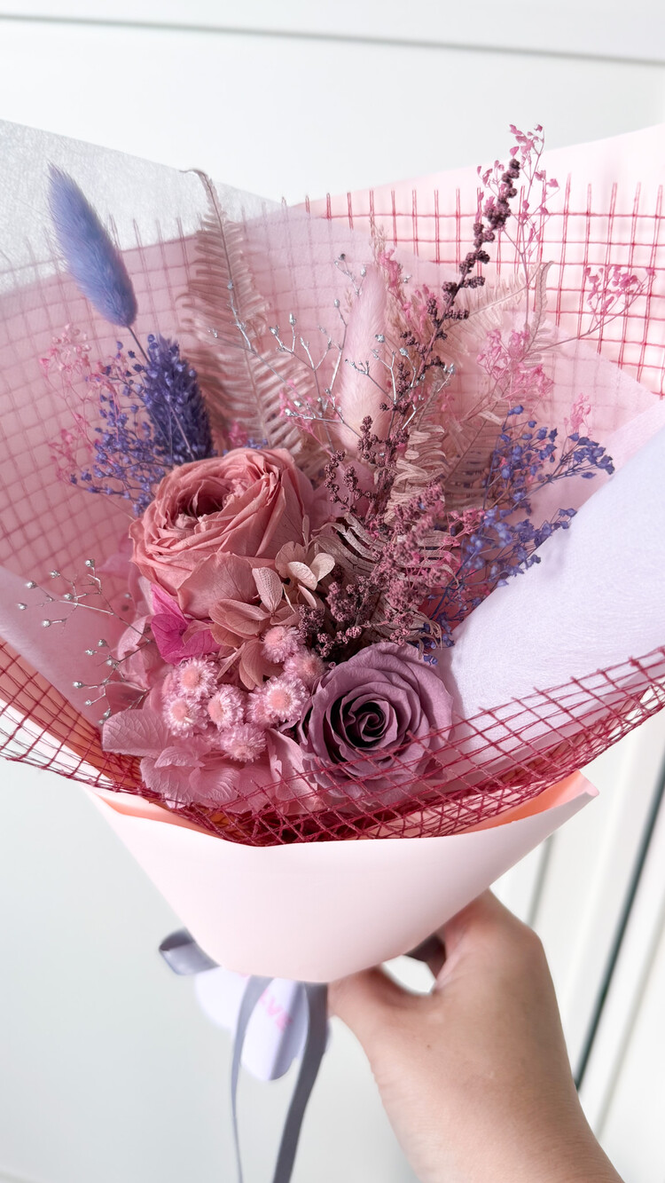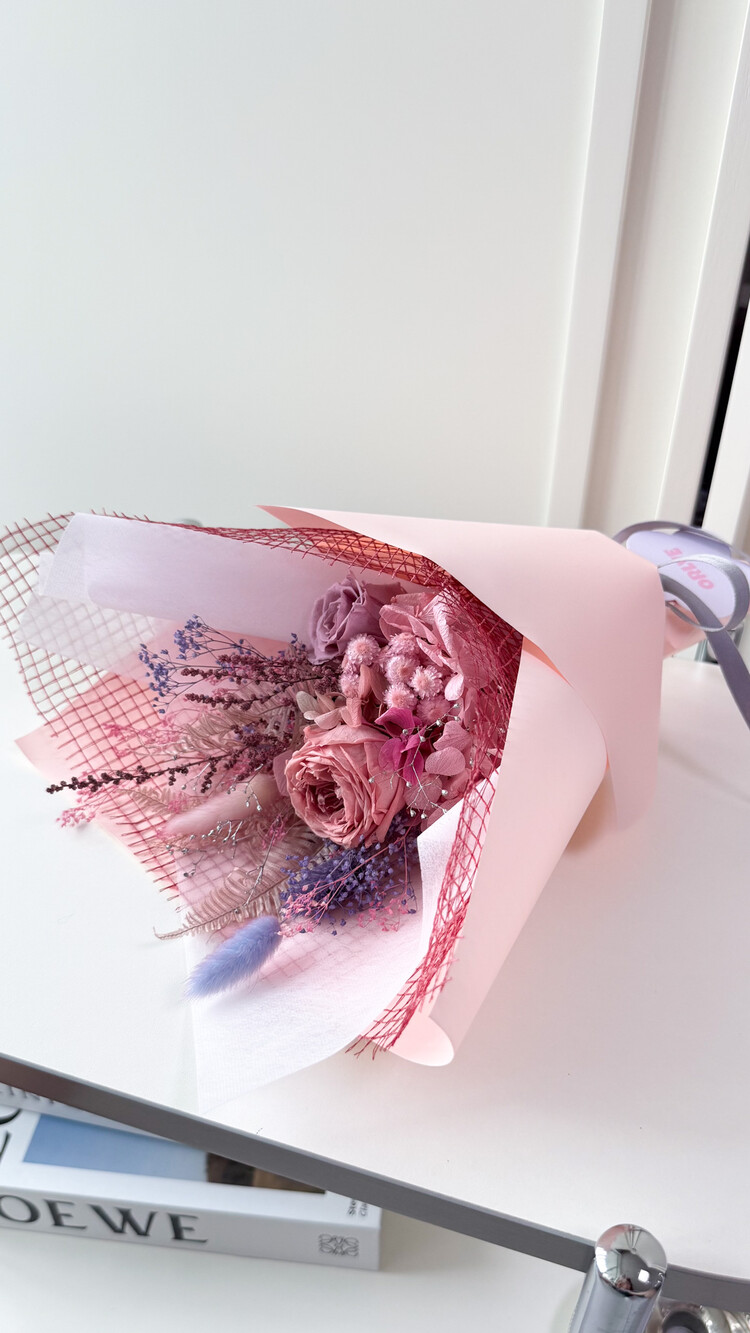 그레이시 퍼플, 핑크톤의 프리저브드플라워 장미와 프리저브드 수국이 어우러진 꽃다발입니다.