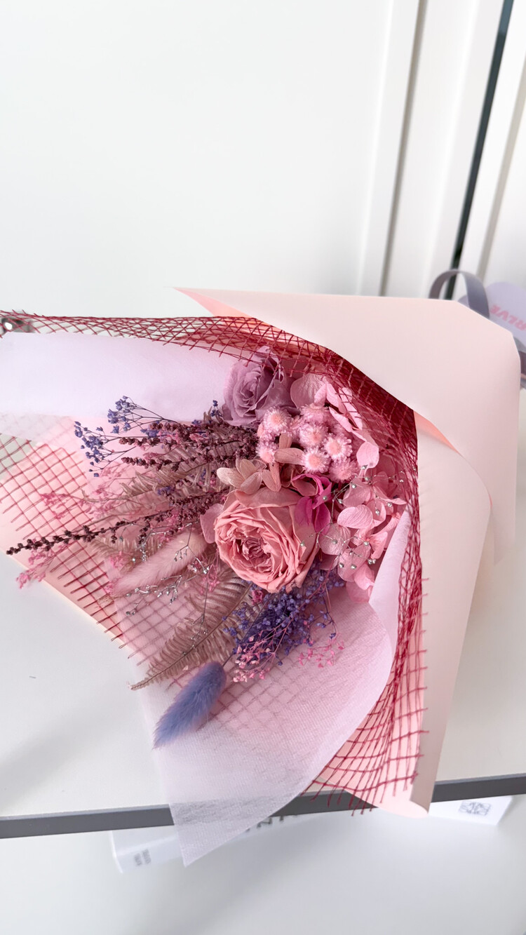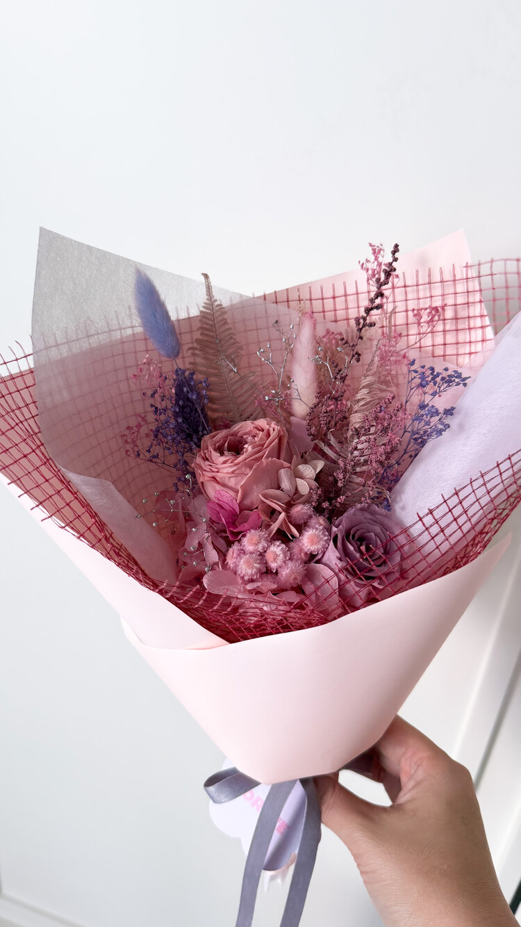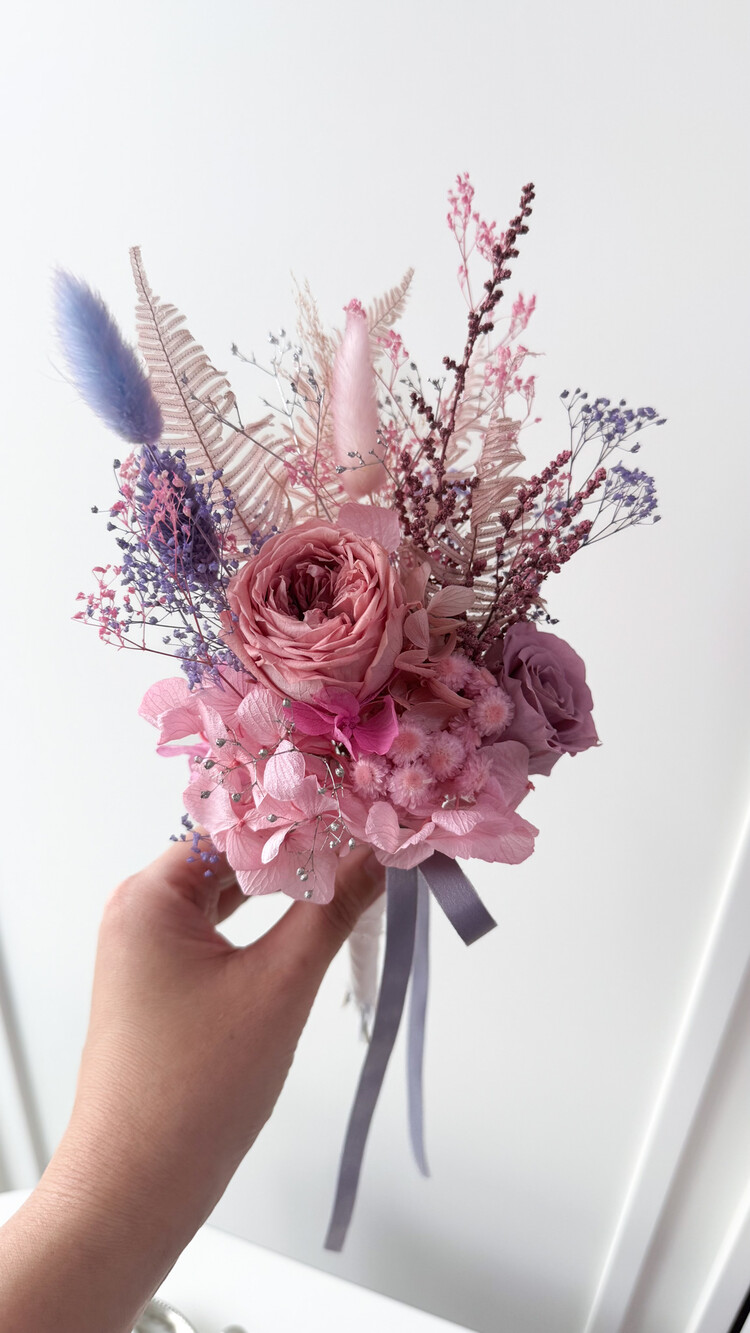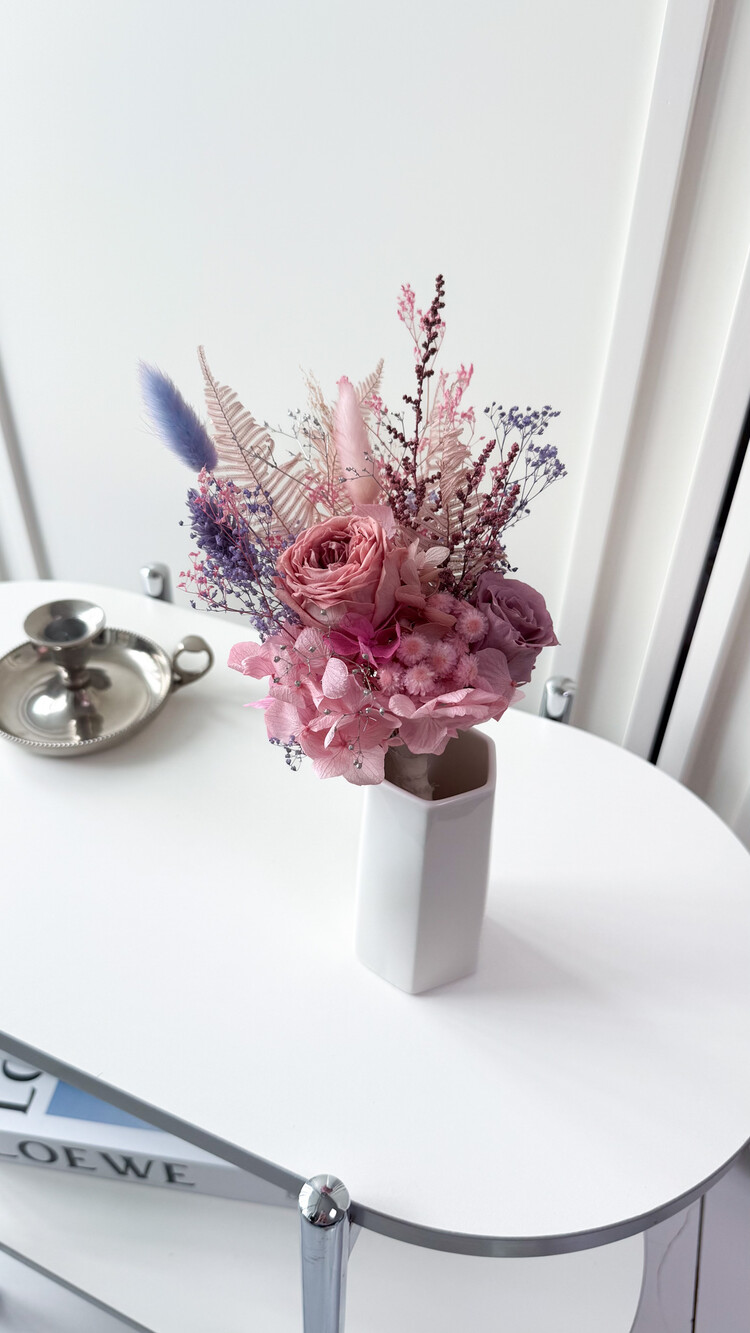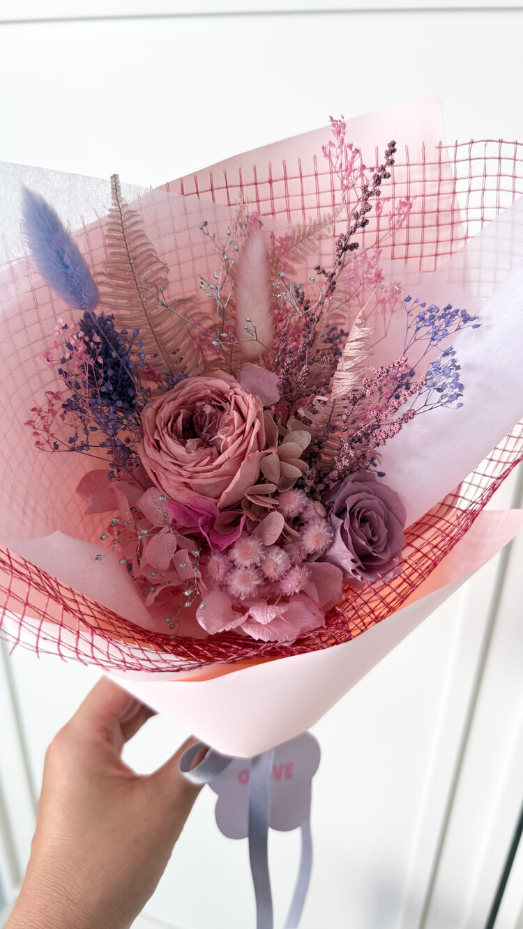 그레이시 퍼플, 핑크톤의 프리저브드플라워 장미와 프리저브드 수국이 어우러진 꽃다발입니다.