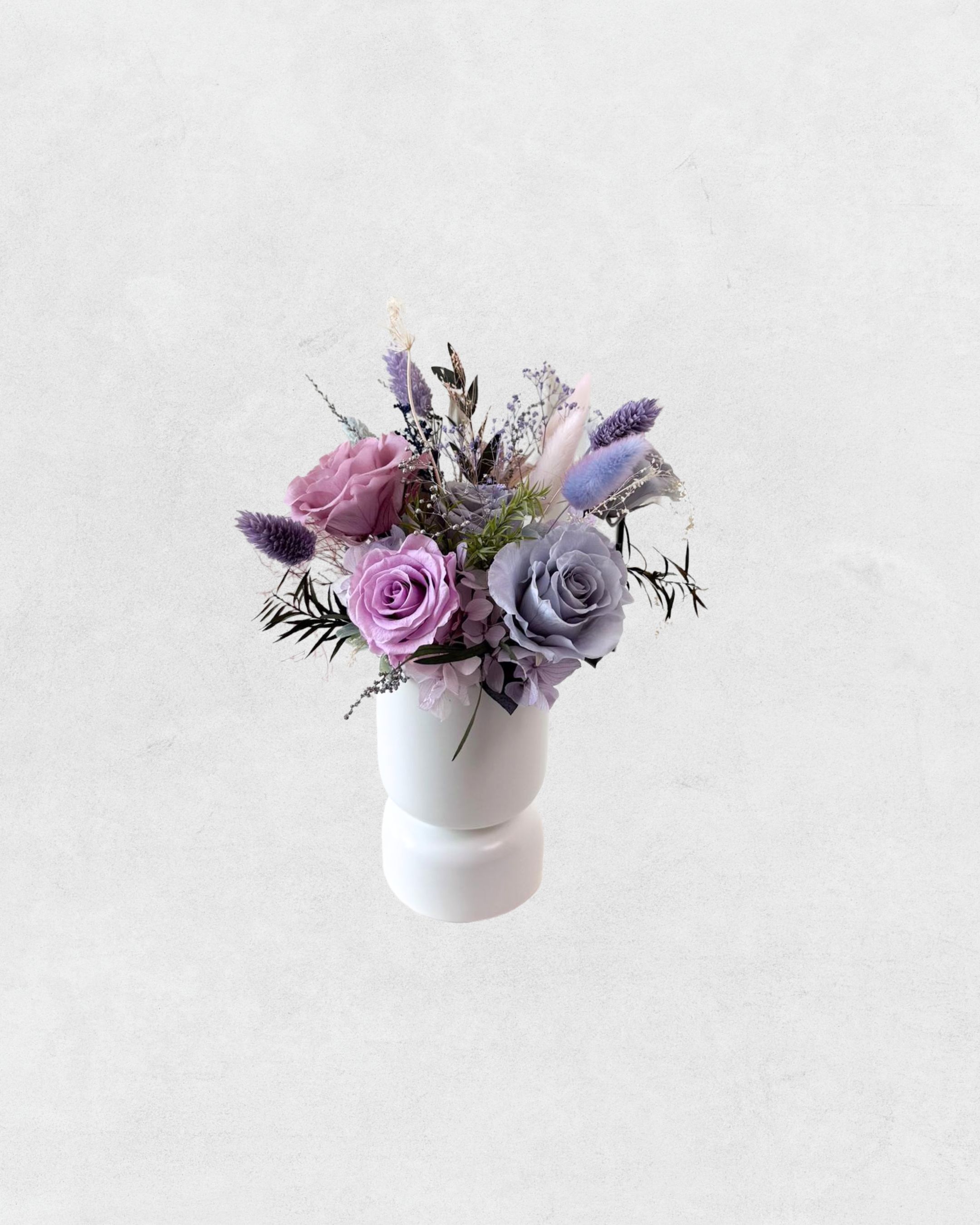 라벤더빛 장미와 더스티 블루 장미가 어우러진 프리저브드플라워 센터피스입니다. 은은한 보랏빛 컬러와 그레이시한 블루톤이 만나 우아한 분위기를 연출하며, 수국과 티트리, 스토베, 프리저브드 안개 등 세밀하게 더해진 그린 소재들이 조화를 이루며 한층 풍부한 디테일을 느끼실 수 있습니다.