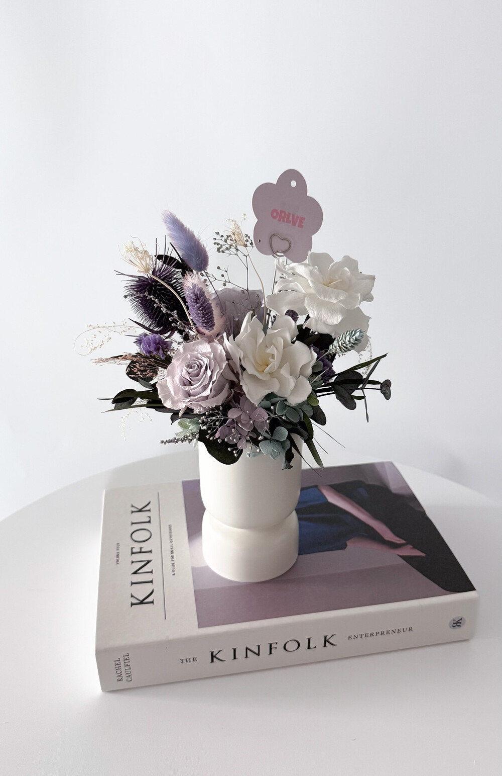 쿨톤의 라벤더 블루와 깊이 있는 그린 소재들, 그리고 순백의 플라워들이 어우러져 세련되면서도 깔끔한 분위기를 자아냅니다.