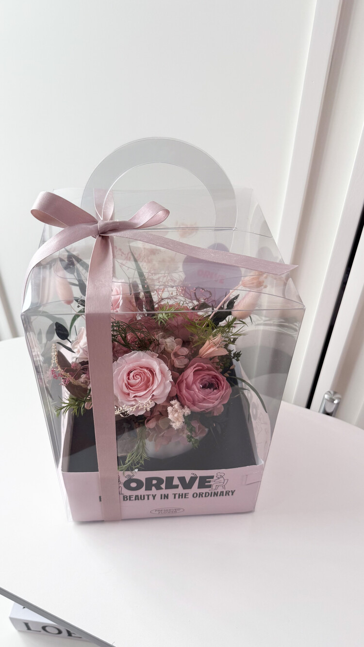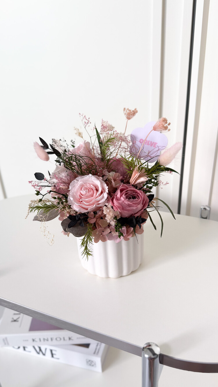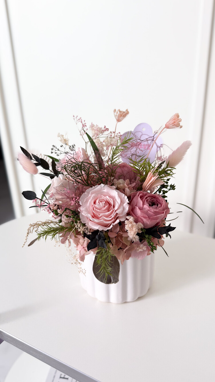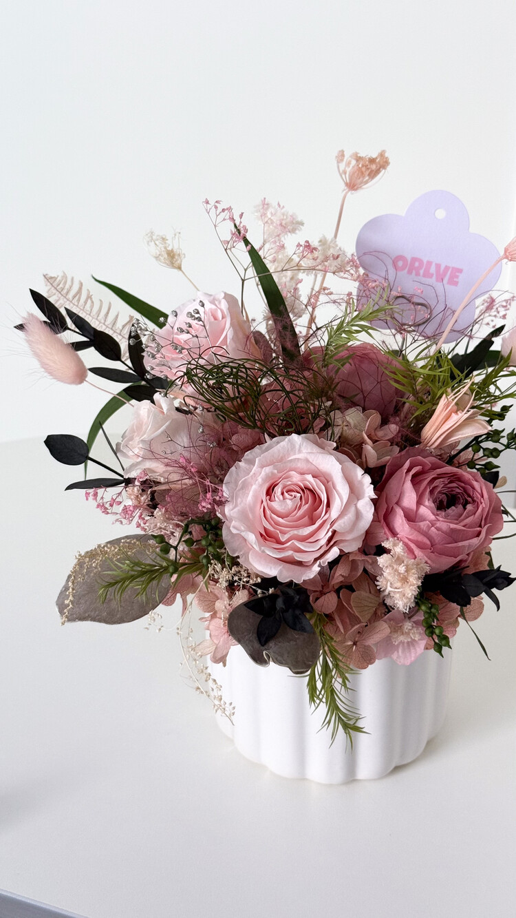사랑스러운 핑크톤의 프리저브드 장미 다섯 송이와 에버그린 컬러의 티트리와 유칼립투스가 함께 어우러져 마치 갓 꺾은 듯한 신선함 느낌을 받으실 수 있도록 제작된 프리저브드플라워 센터피스입니다.