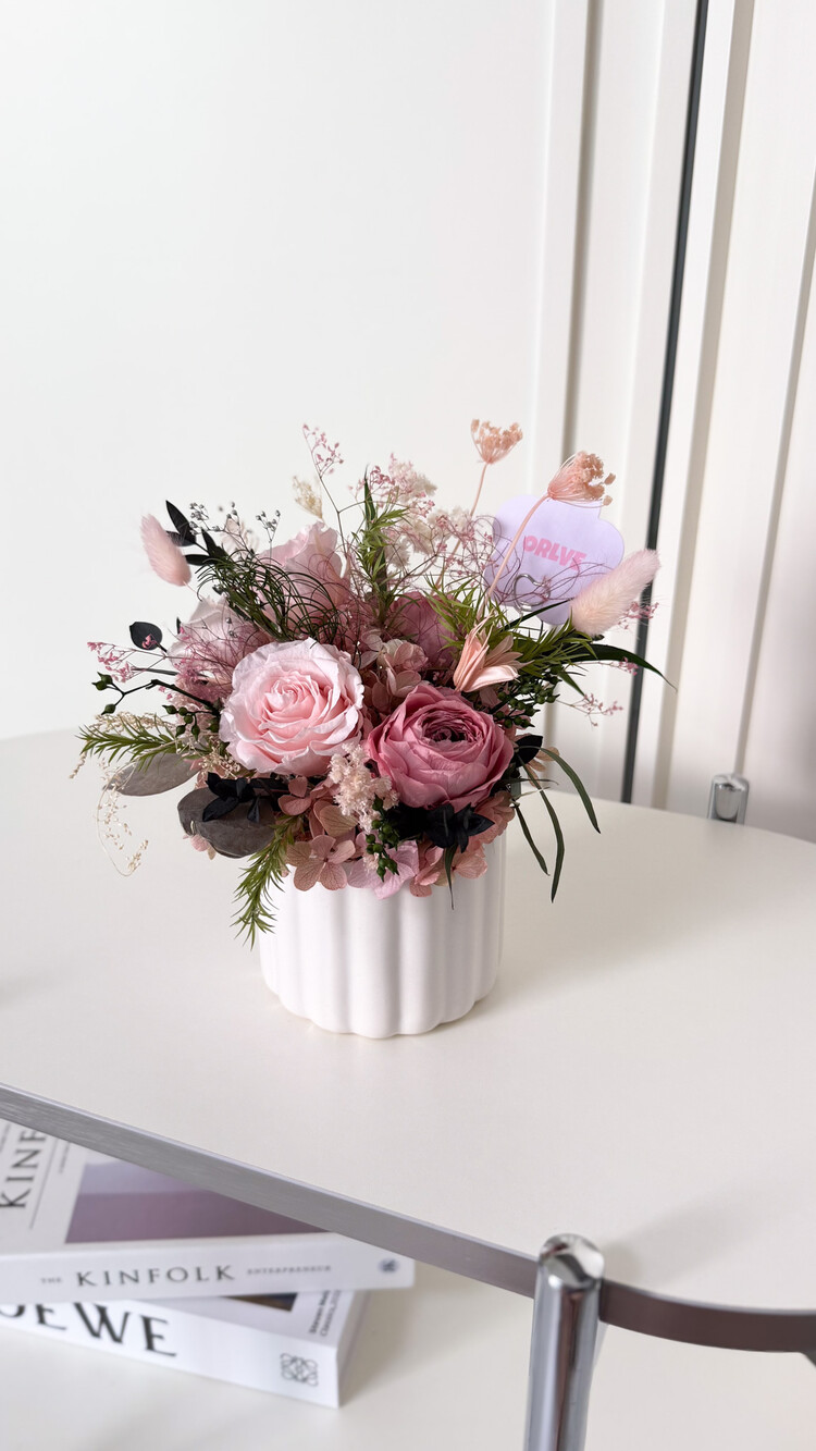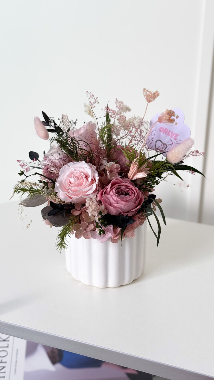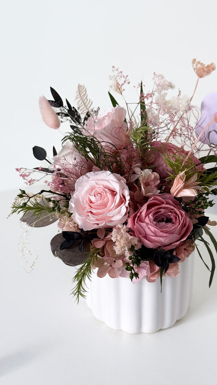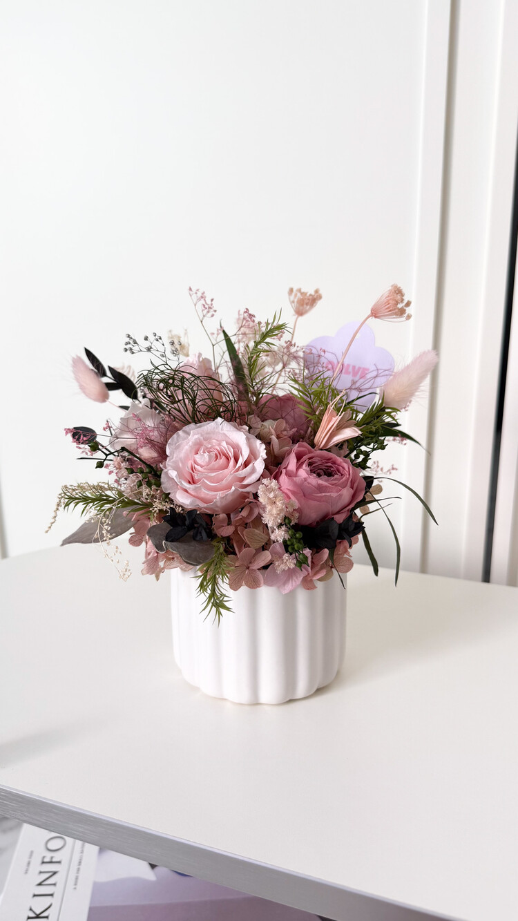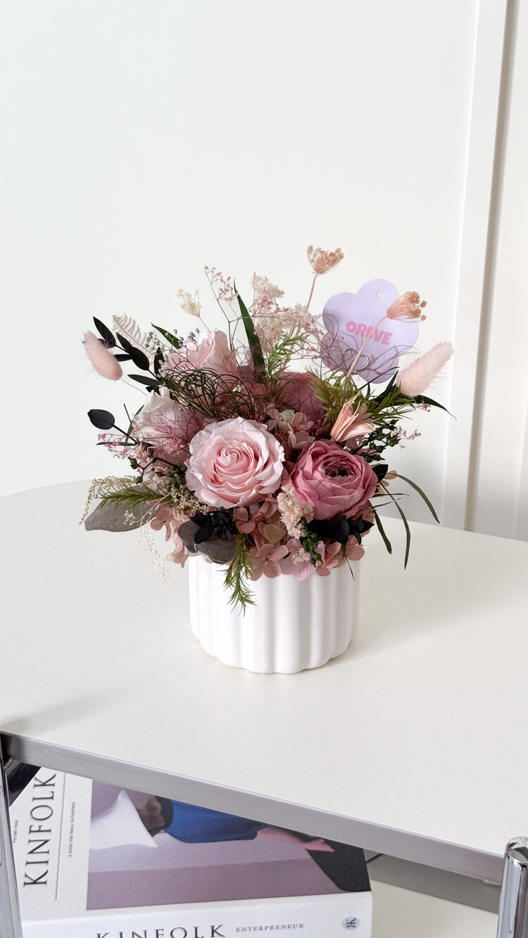사랑스러운 핑크톤의 프리저브드 장미 다섯 송이와 에버그린 컬러의 티트리와 유칼립투스가 함께 어우러져 마치 갓 꺾은 듯한 신선함 느낌을 받으실 수 있도록 제작된 프리저브드플라워 센터피스입니다.
