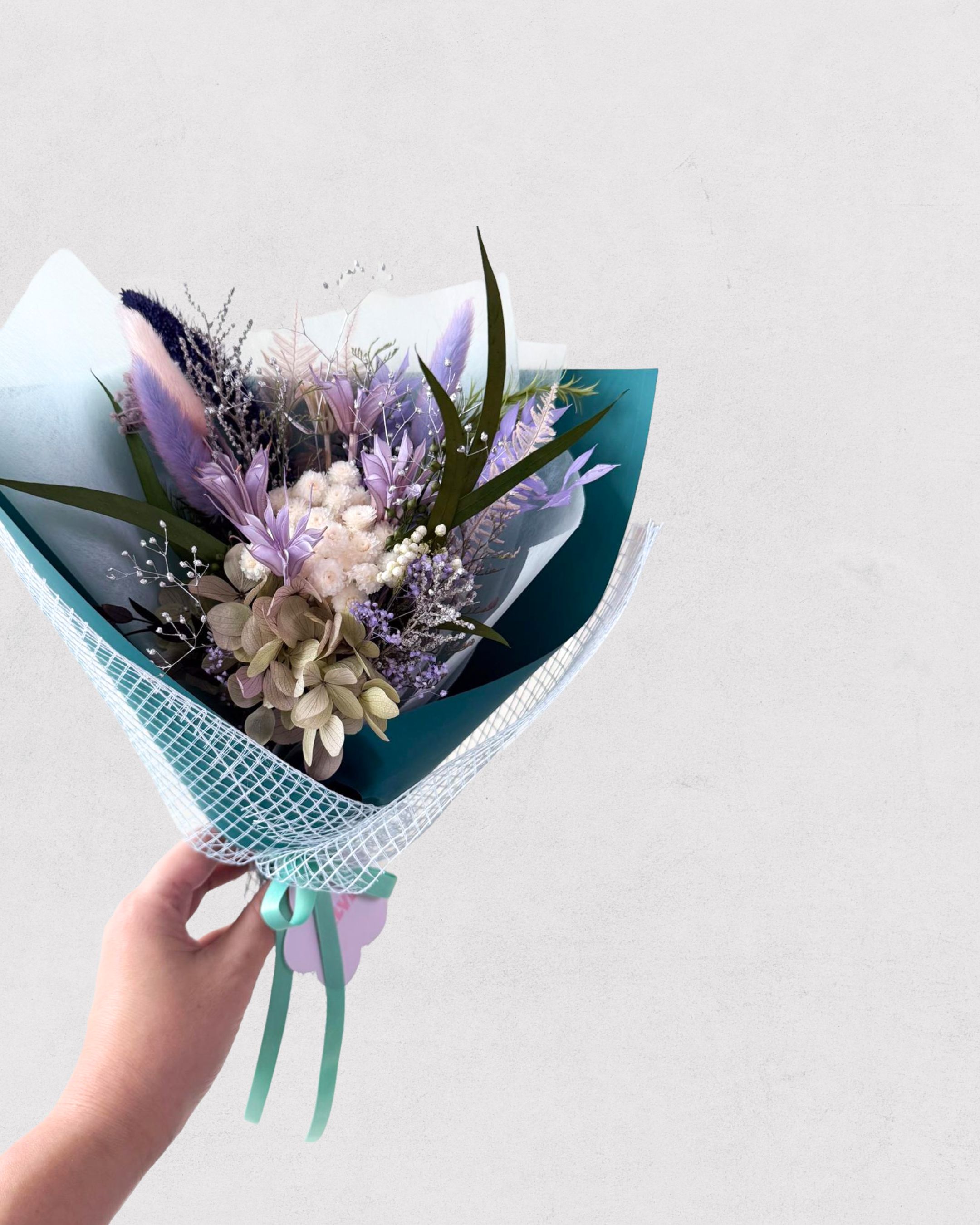 라임빛과 퍼플톤이 은은하게 섞인 프리저브드 수국에 싱그러운 그린 소재와 부드러운 라벤더 컬러가 어우러진 꽃다발입니다. 보랏빛과 그린이 자연스럽게 조화를 이루며, 실제로 보면 색이 겹겹이 번지듯 오묘한 분위기를 느낄 수 있습니다.